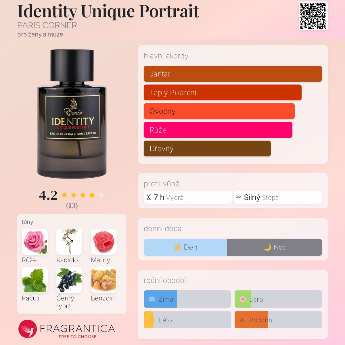 Identity Unique Portrait podle PARIS CORNER je Orientální Floral vůně pro ženy a muže. Identity Unique Portrait byl/a uveden/a v roce 2021. Vrchní tóny jsou Růže, Maliny, Černý rybíz, Skořice a Hřebíček; střední tóny jsouKadidlo, Pačuli a Santalové dřevo ; základní tóny jsou Benzoin, Jantar (ambra) a Pižmo.