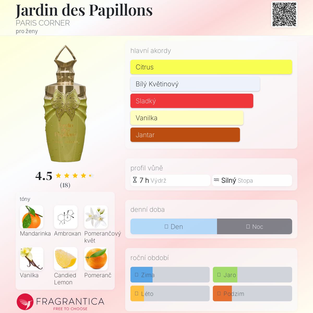 Jardin des Papillons podle PARIS CORNER je Citrus Aromatic vůně pro ženy. Toto je nová vůně. Jardin des Papillons byl/a uveden/a v roce 2025. Vrchní tóny jsou Mandarinka, Kandovaný citron a Pomeranč; střední tóny jsouPomerančový květ a Jasmín ; základní tóny jsou Ambroxan, Vanilka a Cukr.