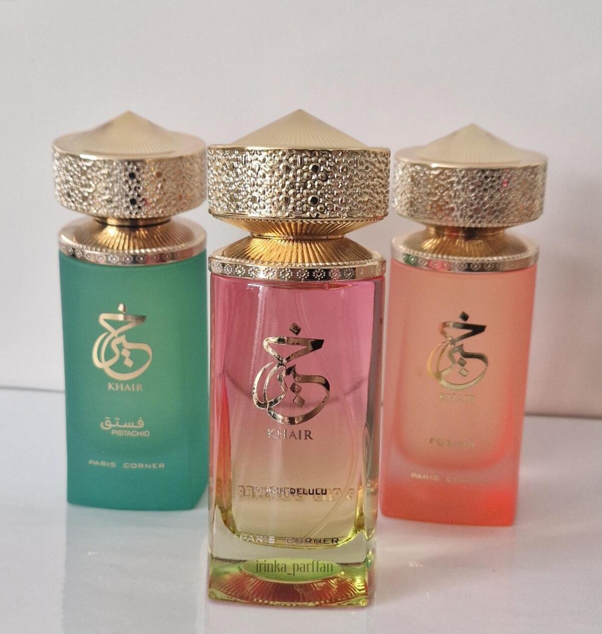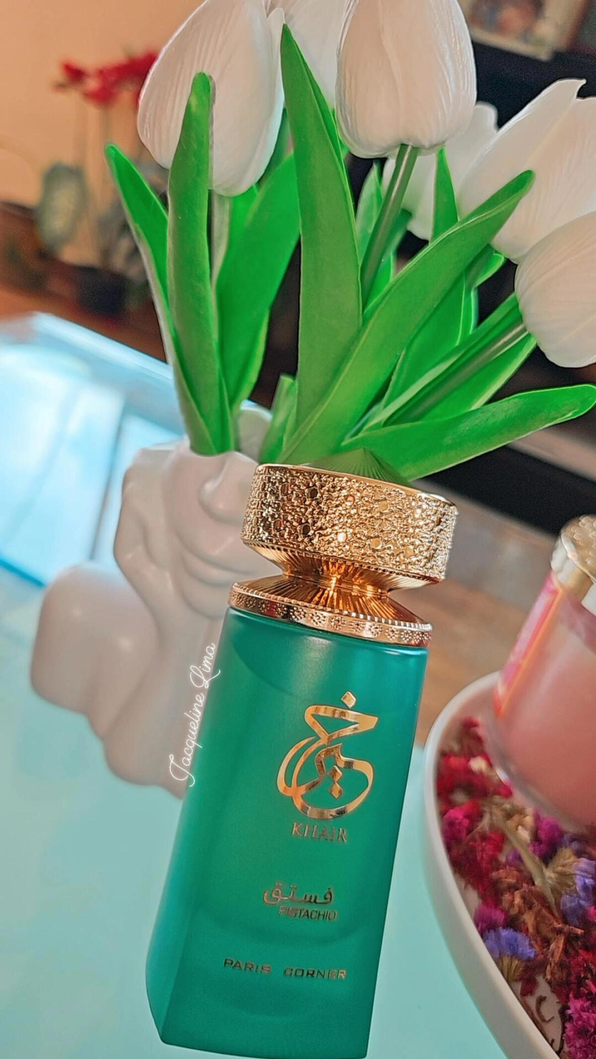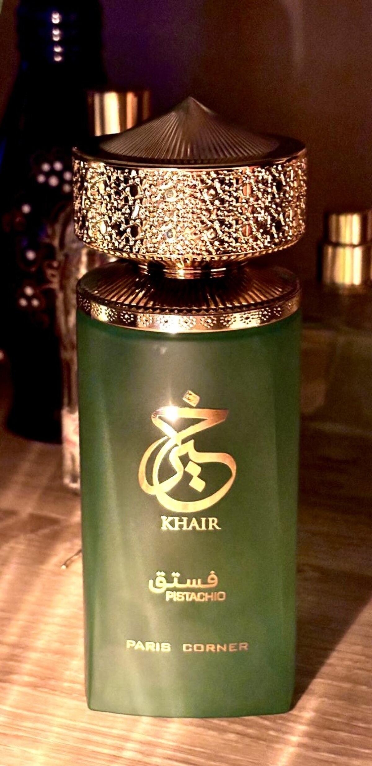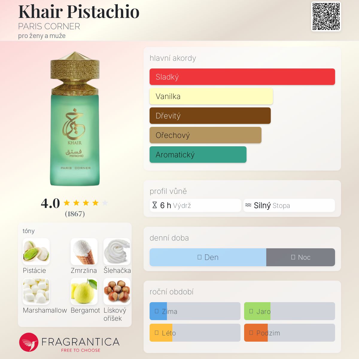 Khair Pistachio podle PARIS CORNER je Floral Fruity Gourmand vůně pro ženy a muže. Khair Pistachio byl/a uveden/a v roce 2023. Vrchní tóny jsou Pistácie, Zmrzlina, Bergamot, Lískový oříšek, Kardamom a Rum; střední tóny jsouHruška, Jasmín, Pivoňka, Pelargónie, Maliny a Bílá broskev ; základní tóny jsou Šlehačka, Marshamallow, Cukrová vata, Fazole tonka a Cedr.