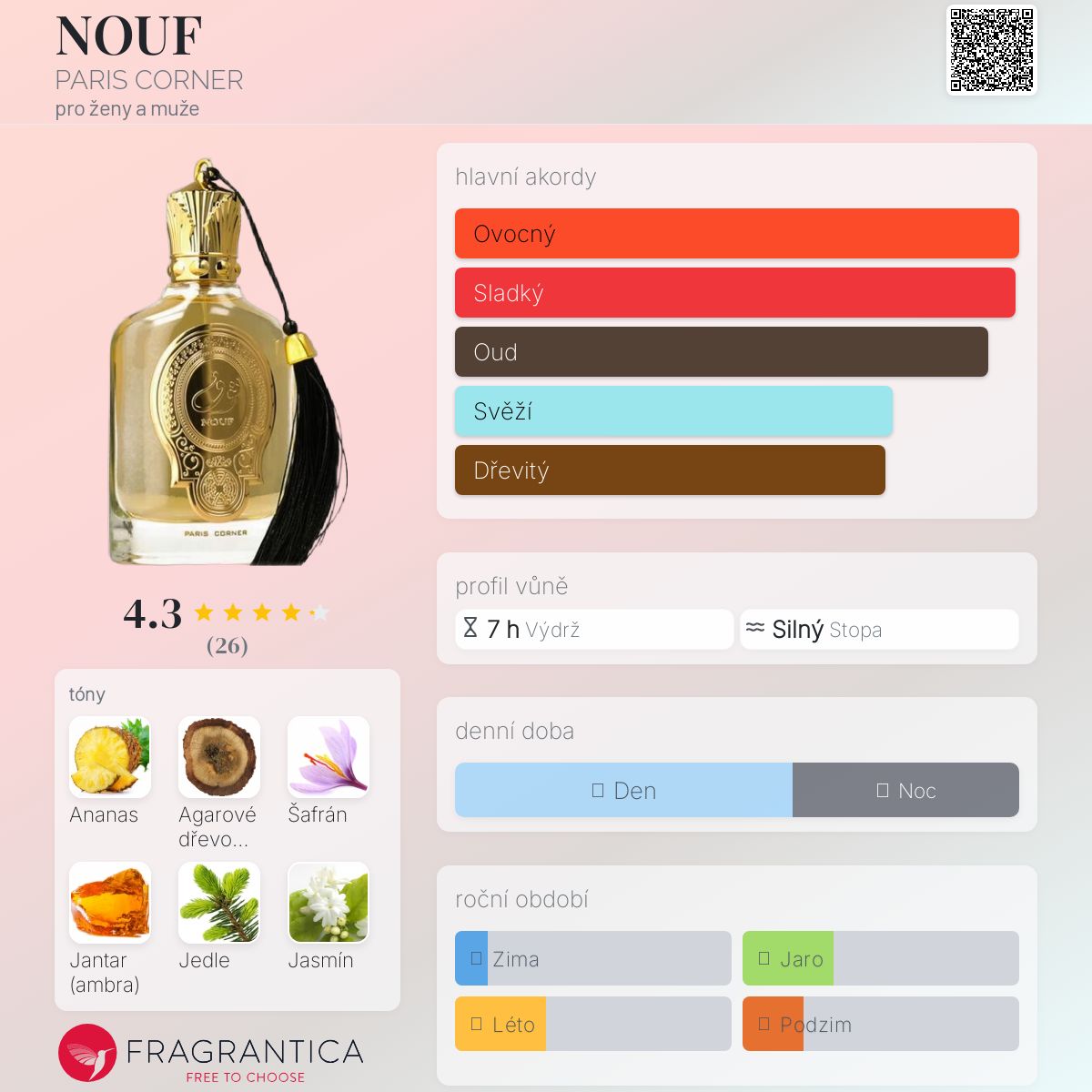 NOUF podle PARIS CORNER je Orientální Woody vůně pro ženy a muže. NOUF byl/a uveden/a v roce 2022. Vrchní tóny jsou Ananas a Šafrán; střední tóny jsouJedle balzámová a Jasmín ; základní tóny jsou Agarové dřevo (oud), Jantar (ambra) a Cedr.