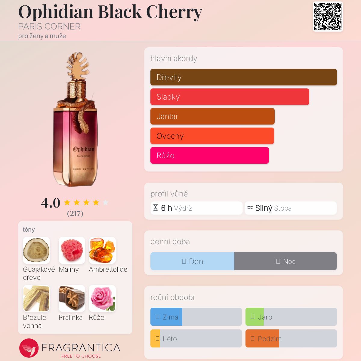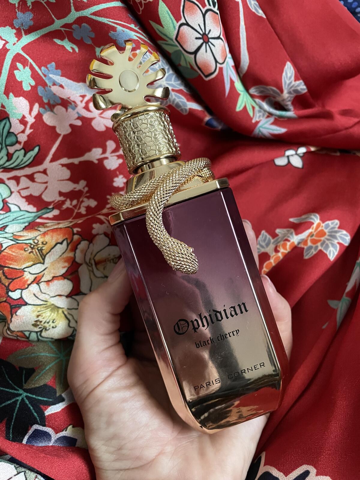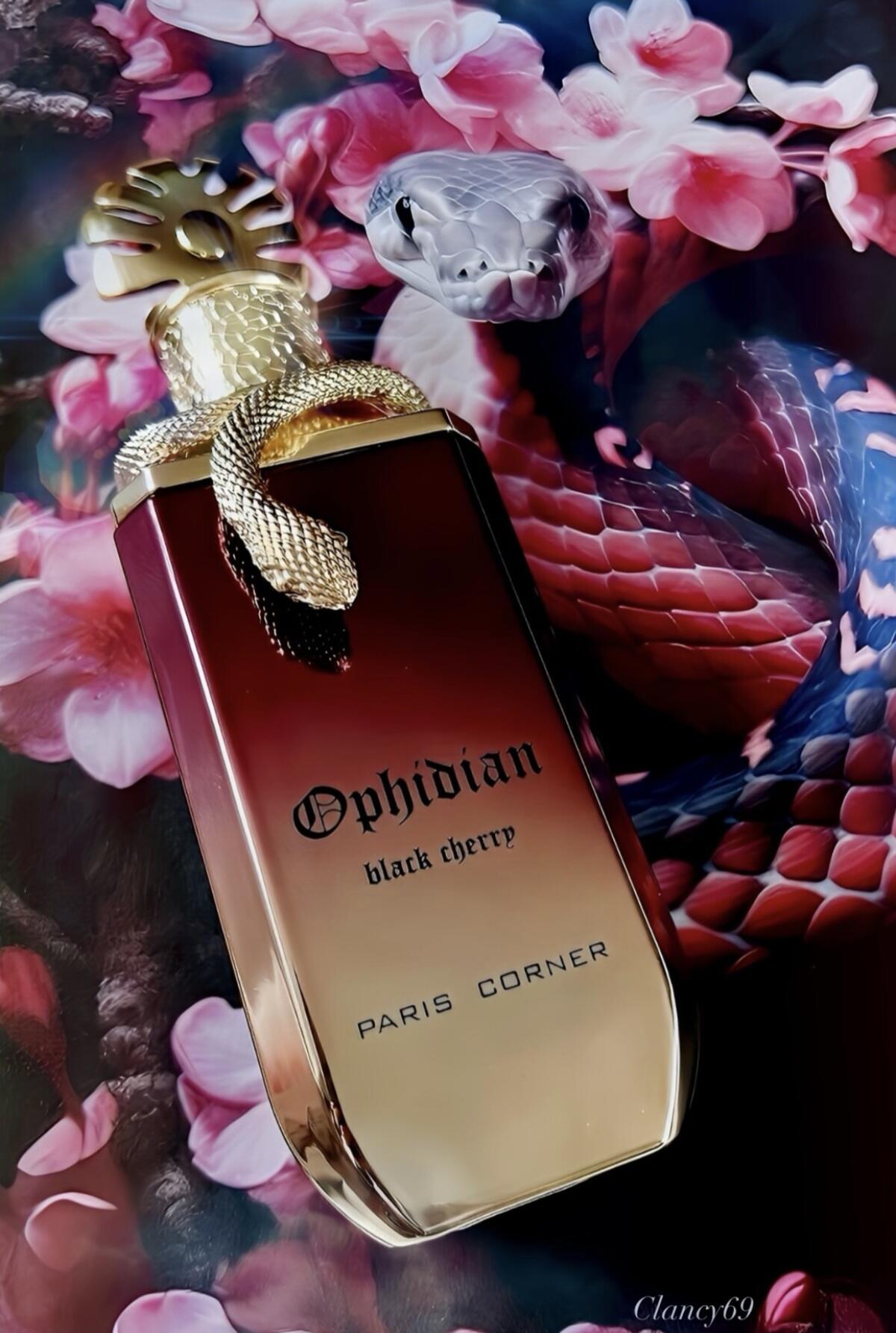 Ophidian Black Cherry podle PARIS CORNER je Woody vůně pro ženy a muže. Toto je nová vůně. Ophidian Black Cherry byl/a uveden/a v roce 2024. Vrchní tóny jsou Maliny a Bergamot; střední tóny jsouPralinka, Damašská růže, Otočník a Jasmín ; základní tóny jsou Guajakové dřevo, Březule vonná, Ambrettolide, Fazole tonka, Pačuli, Vetiver a Hruška.