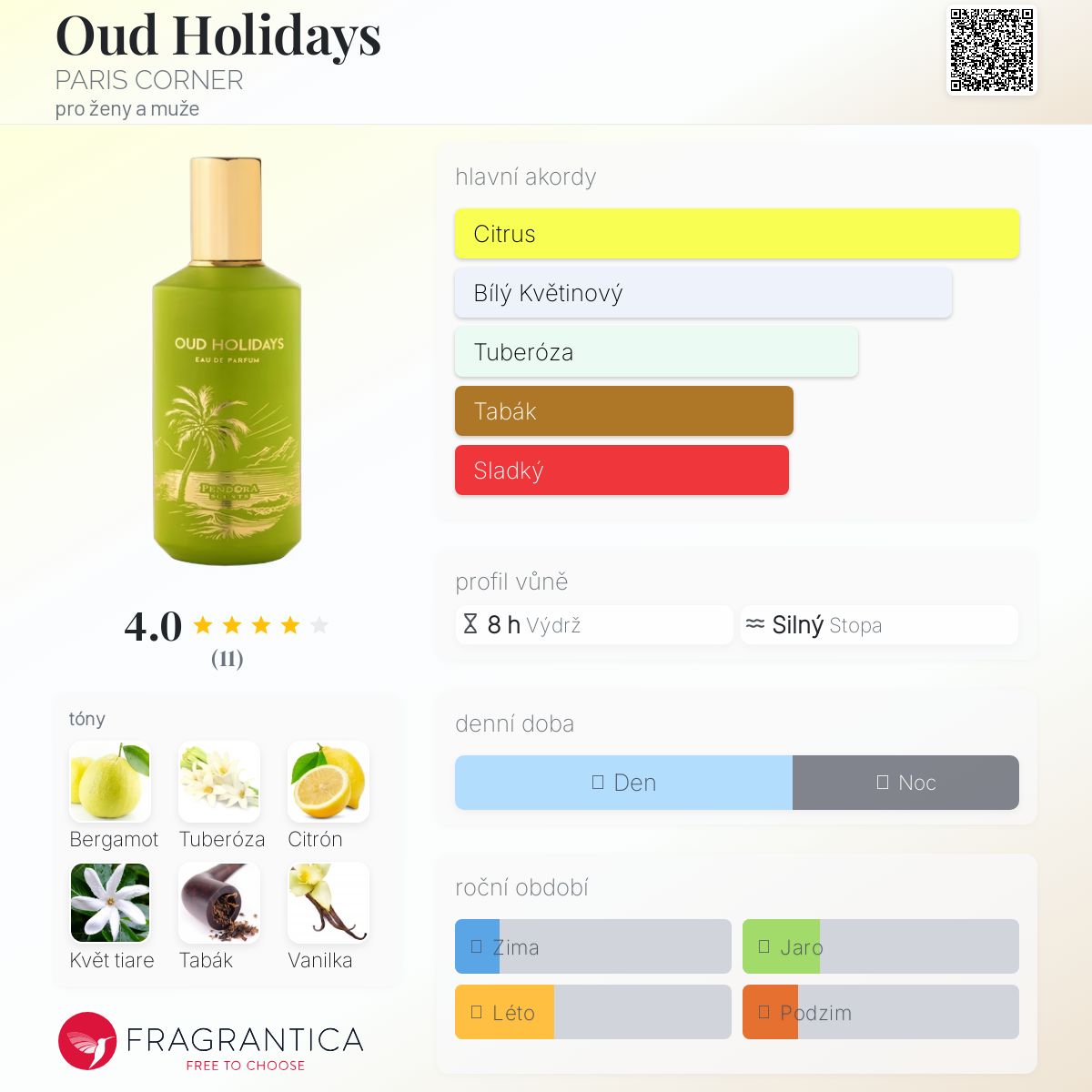 Oud Holidays podle PARIS CORNER je Orientální Woody vůně pro ženy a muže. Toto je nová vůně. Oud Holidays byl/a uveden/a v roce 2024. Vrchní tóny jsou Bergamot, Citrón a Tabák; střední tóny jsouTuberóza a Květ tiare ; základní tóny jsou Vanilka, Kůže a Agarové dřevo (oud).