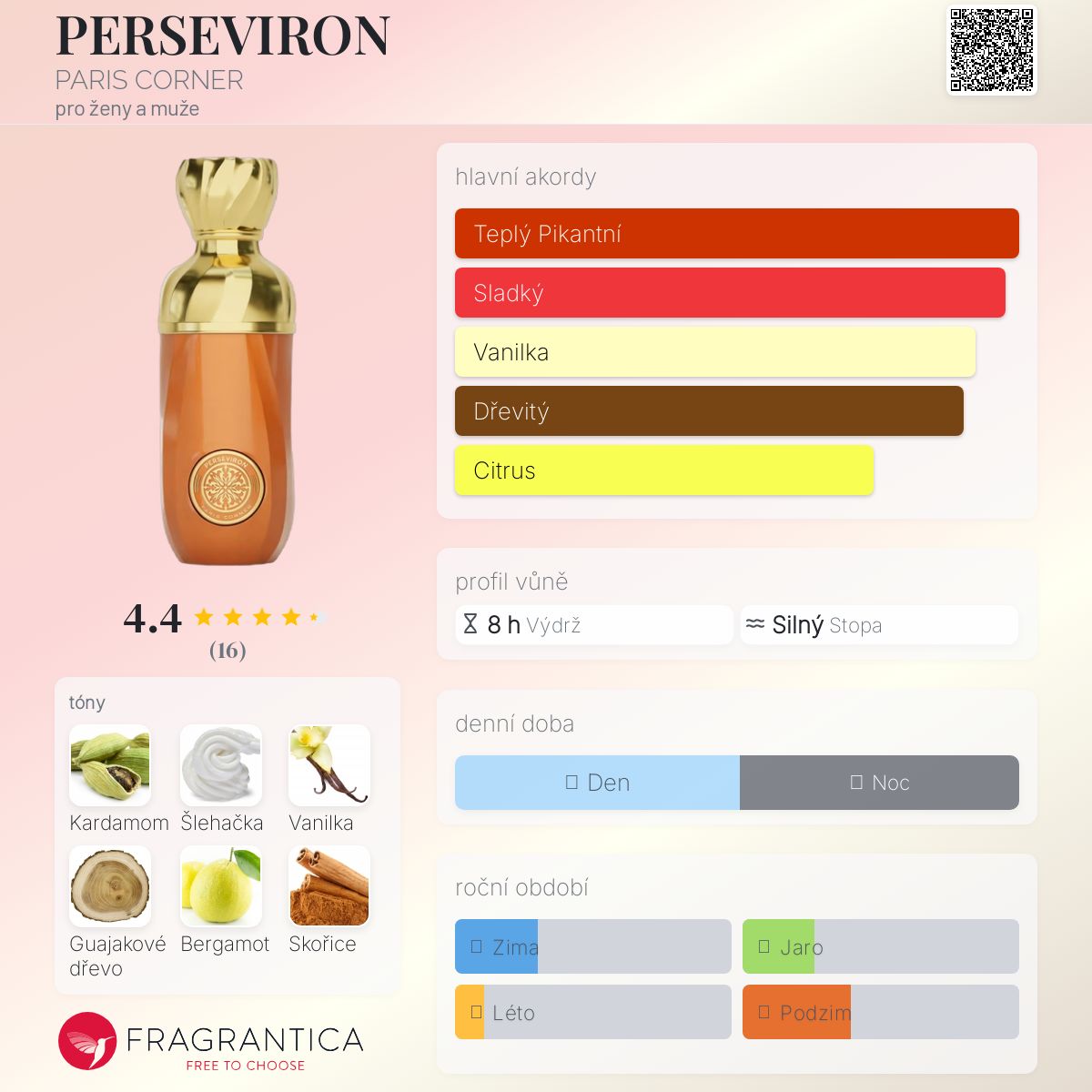 PERSEVIRON podle PARIS CORNER je vůně pro ženy a muže. Toto je nová vůně. PERSEVIRON byl/a uveden/a v roce 2025. Vrchní tóny jsou Kardamom, Bergamot a Skořice; střední tóny jsouŠlehačka, Pralinka a Pomerančový květ ; základní tóny jsou Vanilka, Guajakové dřevo a Suché dřevo.