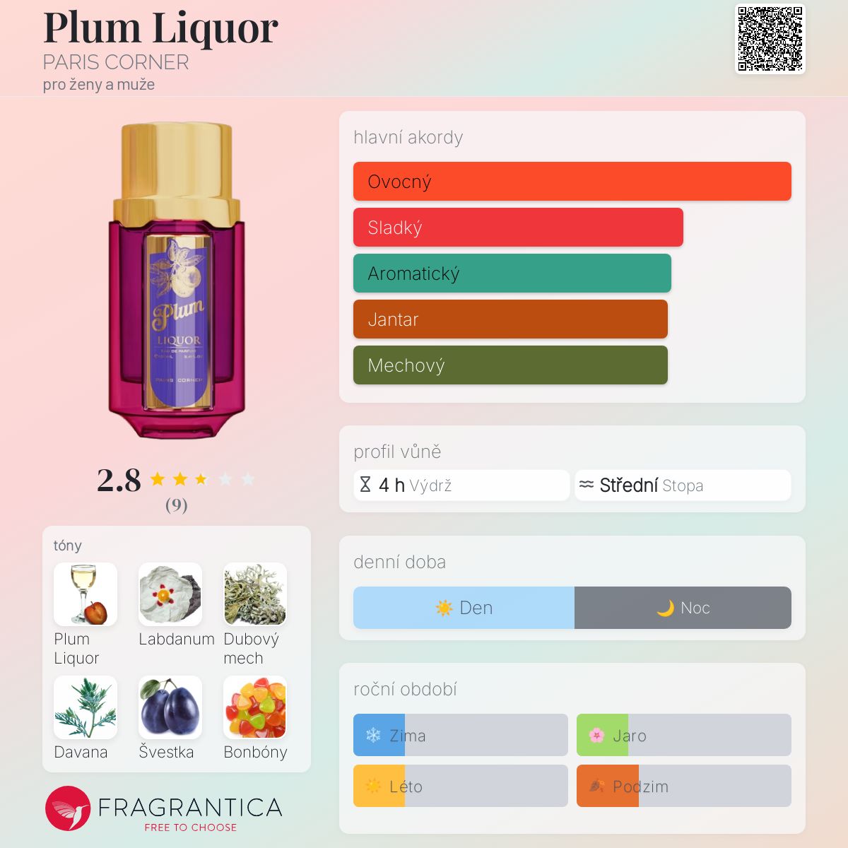 Plum Liquor podle PARIS CORNER je Floral Fruity Gourmand vůně pro ženy a muže. Toto je nová vůně. Plum Liquor byl/a uveden/a v roce 2025. Vrchní tóny jsou Švestka, Hruška a Liči; střední tóny jsouŠvestkový likér, Davana a Růže ; základní tóny jsou Labdanum, Dubový mech a Sladké tóny.