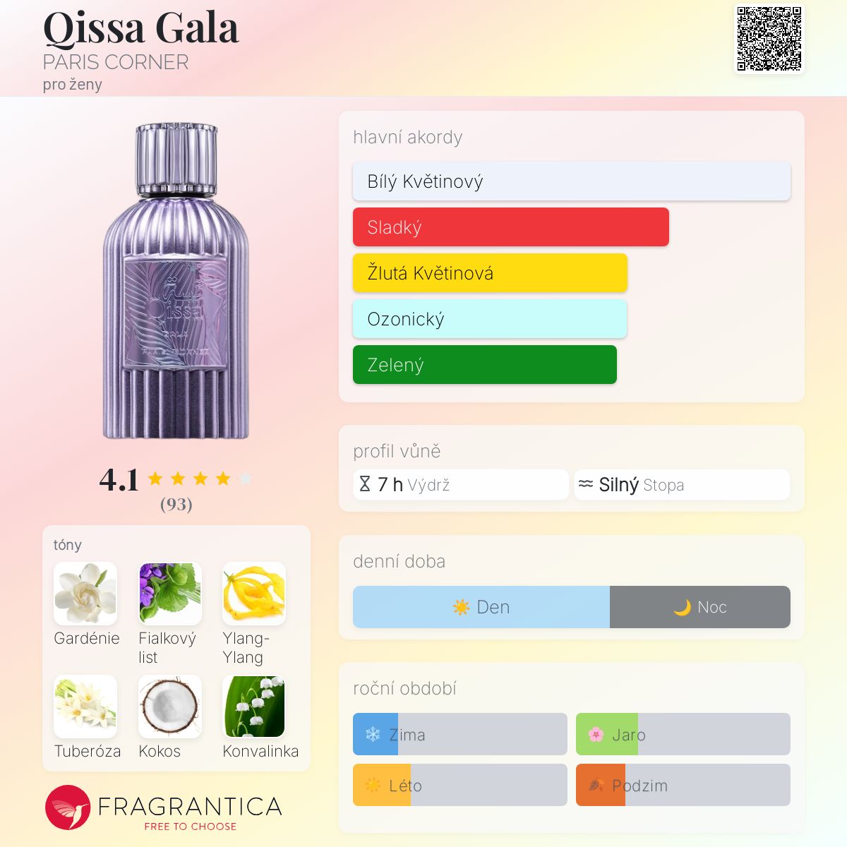 Qissa Gala podle PARIS CORNER je Floral Fruity Gourmand vůně pro ženy. Toto je nová vůně. Qissa Gala byl/a uveden/a v roce 2025. Vrchní tóny jsou Gardénie, Fialkový list, Ylang-Ylang a Mandle; střední tóny jsouTuberóza, Kokos, Konvalinka a Švestka ; základní tóny jsou Pižmo, Vanilka, Sladké tóny a Mech.