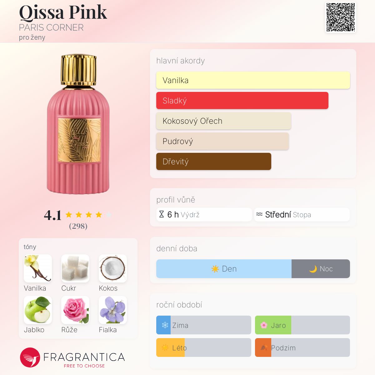 Qissa Pink podle PARIS CORNER je Floral Fruity vůně pro ženy. Qissa Pink byl/a uveden/a v roce 2024. Vrchní tóny jsou Kokos a Jablko; střední tóny jsouRůže, Fialka a Jasmín ; základní tóny jsou Vanilka, Cukr, Santalové dřevo, Cedr a Pačuli.