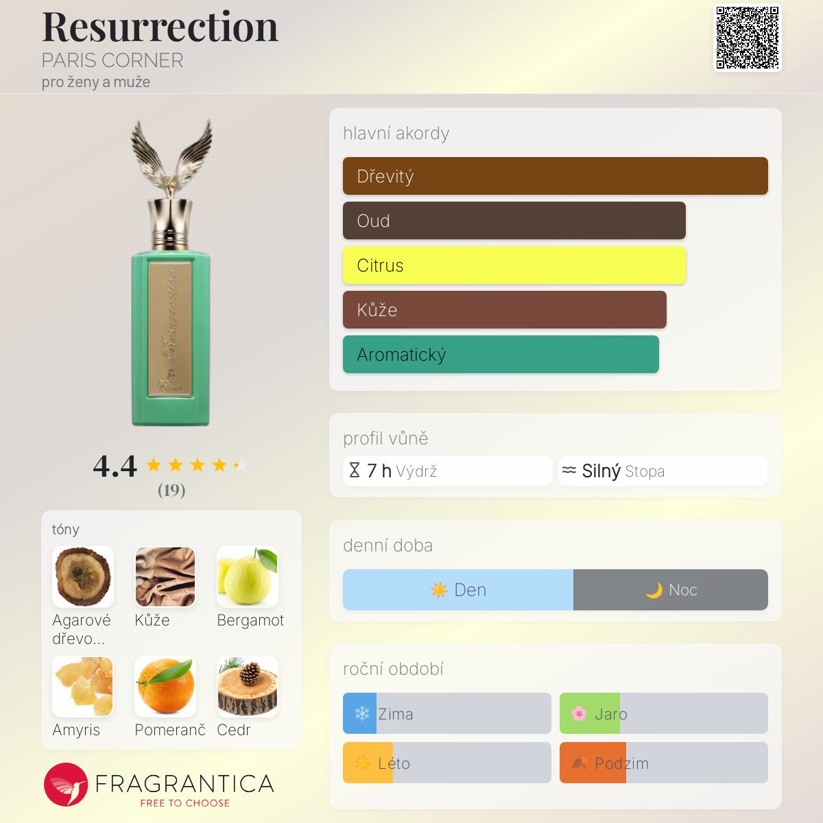 Resurrection podle PARIS CORNER je Leather vůně pro ženy a muže. Resurrection byl/a uveden/a v roce 2022. Vrchní tóny jsou Kalábrijský bergamot a Italský pomeranč; střední tóny jsouAgarové dřevo (oud), Amyris a Koriandr ; základní tóny jsou Kůže, Atlasový cedr, List indonéského pačuli, Santalové dřevo a Pižmo.