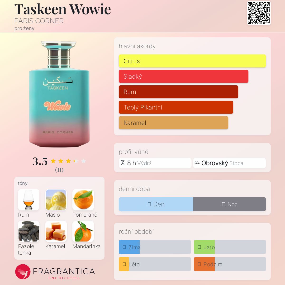 Taskeen Wowie podle PARIS CORNER je Floral Fruity Gourmand vůně pro ženy. Taskeen Wowie byl/a uveden/a v roce 2023. Vrchní tóny jsou Mandarinka, Pomeranč a Aldehydy; střední tóny jsouRum, Skořice a Orris ; základní tóny jsou Fazole tonka, Máslo a Karamel.