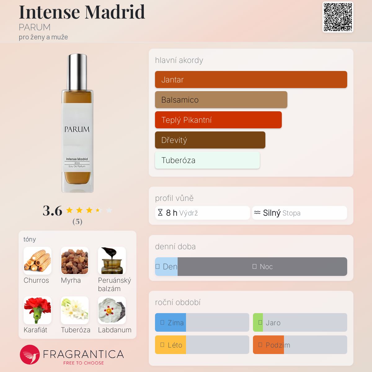 Intense Madrid podle PARUM je Floral vůně pro ženy a muže. Intense Madrid byl/a uveden/a v roce 2020.
