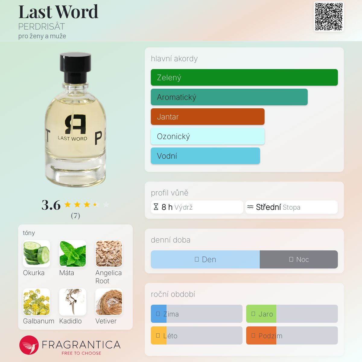 Last Word podle PERDRISÂT je Woody Aromatic vůně pro ženy a muže. Last Word byl/a uveden/a v roce 2022. "Nosem" za touto vůní je Callum Rory Mitchell.