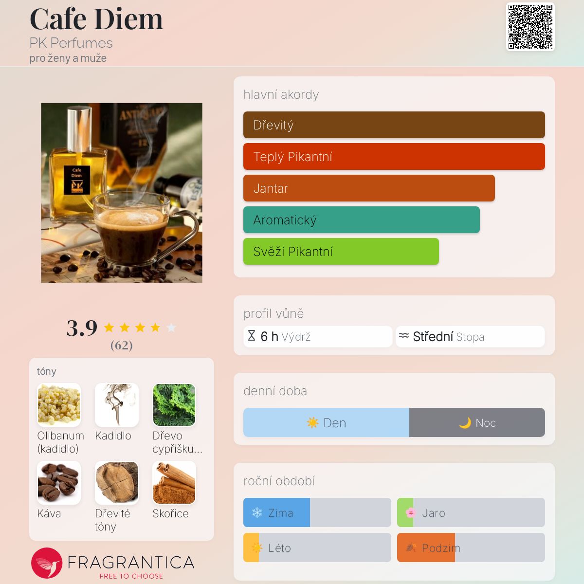 Cafe Diem podle PK Perfumes je Woody Aromatic vůně pro ženy a muže. Cafe Diem byl/a uveden/a v roce 2012. "Nosem" za touto vůní je Paul Kiler.