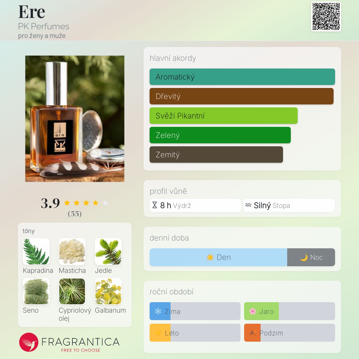 Ere podle PK Perfumes je Aromatic Green vůně pro ženy a muže. Ere byl/a uveden/a v roce 2012. "Nosem" za touto vůní je Paul Kiler.