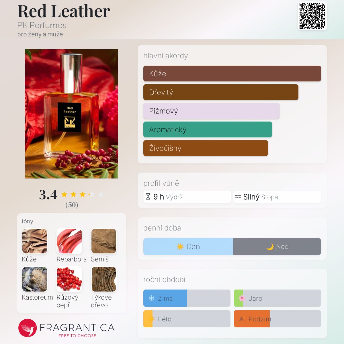 Red Leather podle PK Perfumes je Leather vůně pro ženy a muže. Red Leather byl/a uveden/a v roce 2012. "Nosem" za touto vůní je Paul Kiler.