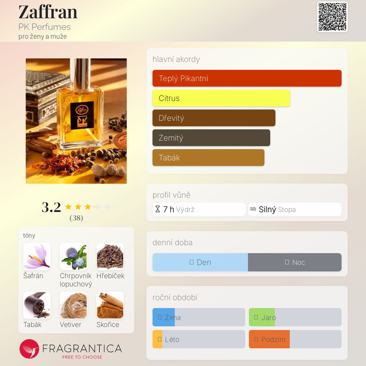 Zaffran podle PK Perfumes je Leather vůně pro ženy a muže. Zaffran byl/a uveden/a v roce 2012. "Nosem" za touto vůní je Paul Kiler.