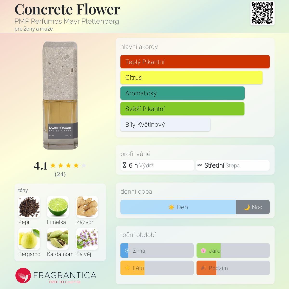 Concrete Flower podle PMP Perfumes Mayr Plettenberg je Aromatic vůně pro ženy a muže. Concrete Flower byl/a uveden/a v roce 2014. "Nosem" za touto vůní je Mark Buxton. Vrchní tóny jsou Černý pepř, Limetka, Bergamot, Kardamom, Šalvěj, Tymián a Mandarinka; střední tóny jsouZázvor, Hřebíček, Lilie, Kosatec, Neroli a Jasmín ; základní tóny jsou Styrax, Santalové dřevo, Jantar (ambra), Pižmo, Cedr a Dubový mech.