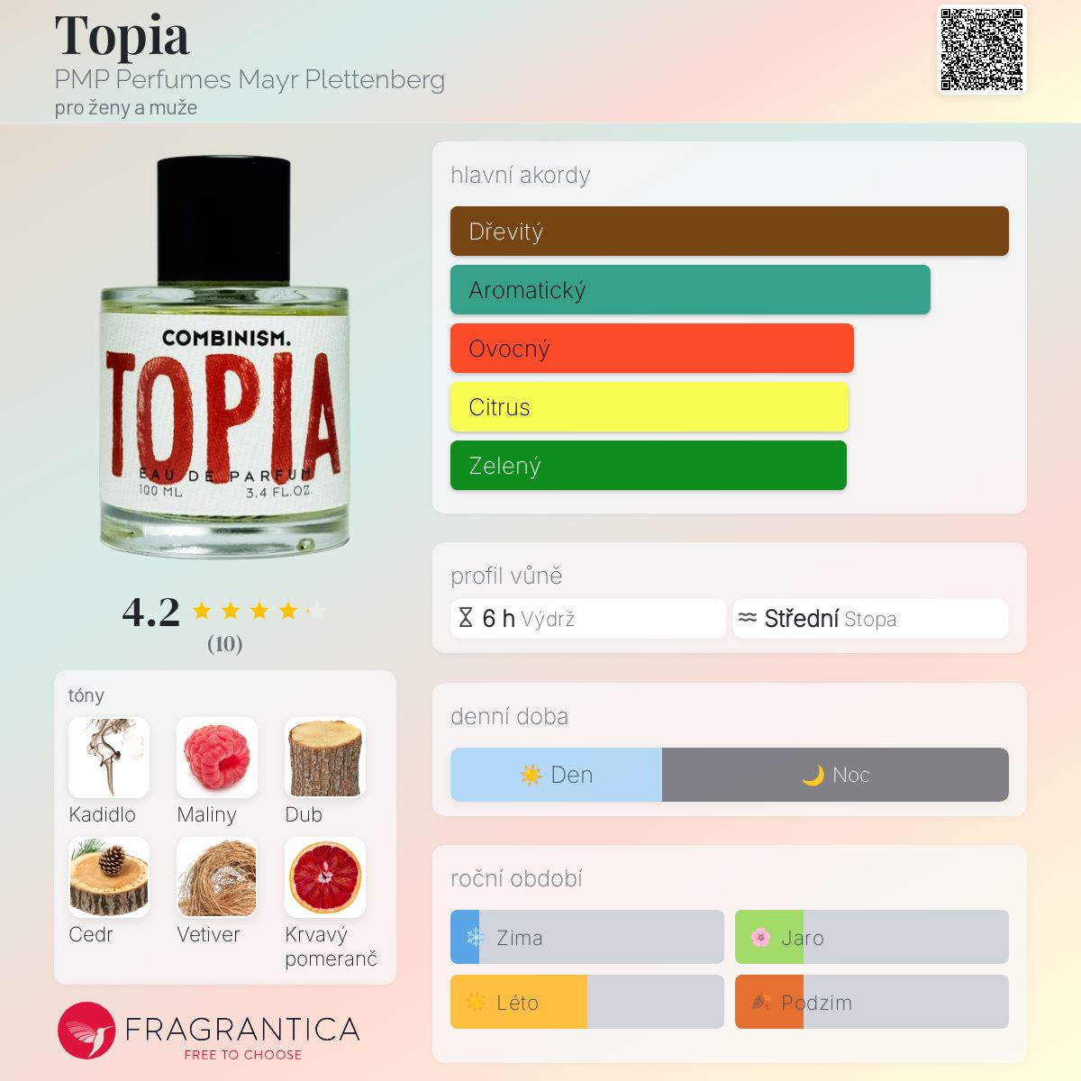 Topia podle PMP Perfumes Mayr Plettenberg je vůně pro ženy a muže. Topia byl/a uveden/a v roce 2018. Topia byl/a vytvořen/a Mark Buxton a David Chieze. Vrchní tóny jsou Krvavý pomeranč, Šalvěj, Zelené listí, Rebarbora, Zázvor, Fialka, Zedrát a Bergamot; střední tóny jsouKadidlo, Maliny, Maté, Tabák, Petitgrain a Skořice ; základní tóny jsou Dub, Cedr, Vetiver, Šalvěj a Pižmo.