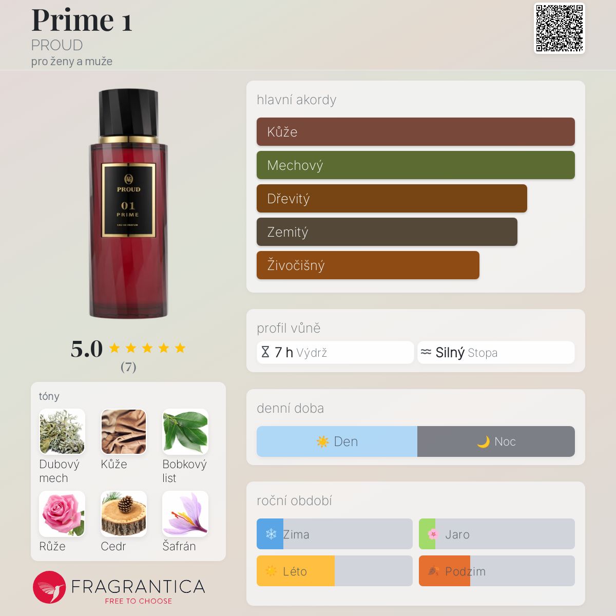 Prime 1 podle PROUD je Leather vůně pro ženy a muže. Toto je nová vůně. Prime 1 byl/a uveden/a v roce 2025. "Nosem" za touto vůní je Pierre-Constantin Guéros. Vrchní tóny jsou Mandarinka, Mango a Červené bobule; střední tóny jsouBobkový list, Růže a Šafrán ; základní tóny jsou Dubový mech, Kůže a Cedr.