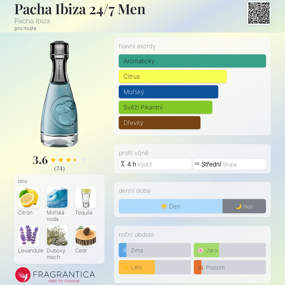 Pacha Ibiza 24/7 Men podle Pacha Ibiza je Citrus Aromatic vůně pro muže. Pacha Ibiza 24/7 Men byl/a uveden/a v roce 2018. Vrchní tóny jsou Italský citrón, Tequila, Pomelo a Kardamom; střední tóny jsouMořské tóny, Levandule, Bazalka a Pelargónie ; základní tóny jsou Mech, Cedr, Jantar (ambra) a Kůže.