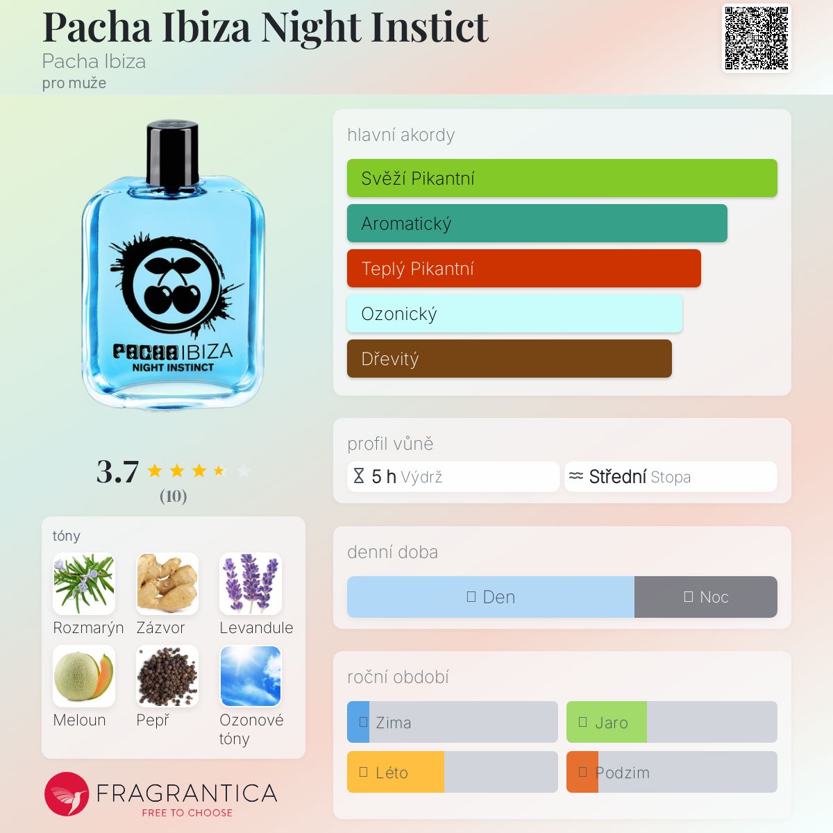 Pacha Ibiza Night Instict podle Pacha Ibiza je Woody Aromatic vůně pro muže. Pacha Ibiza Night Instict byl/a uveden/a v roce 2014. Vrchní tóny jsou Rozmarýn, Levandule, Ozonové tóny a Grapefruit; střední tóny jsouZázvor, Meloun a Pepř ; základní tóny jsou Jantar (ambra), Santalové dřevo a Pižmo.