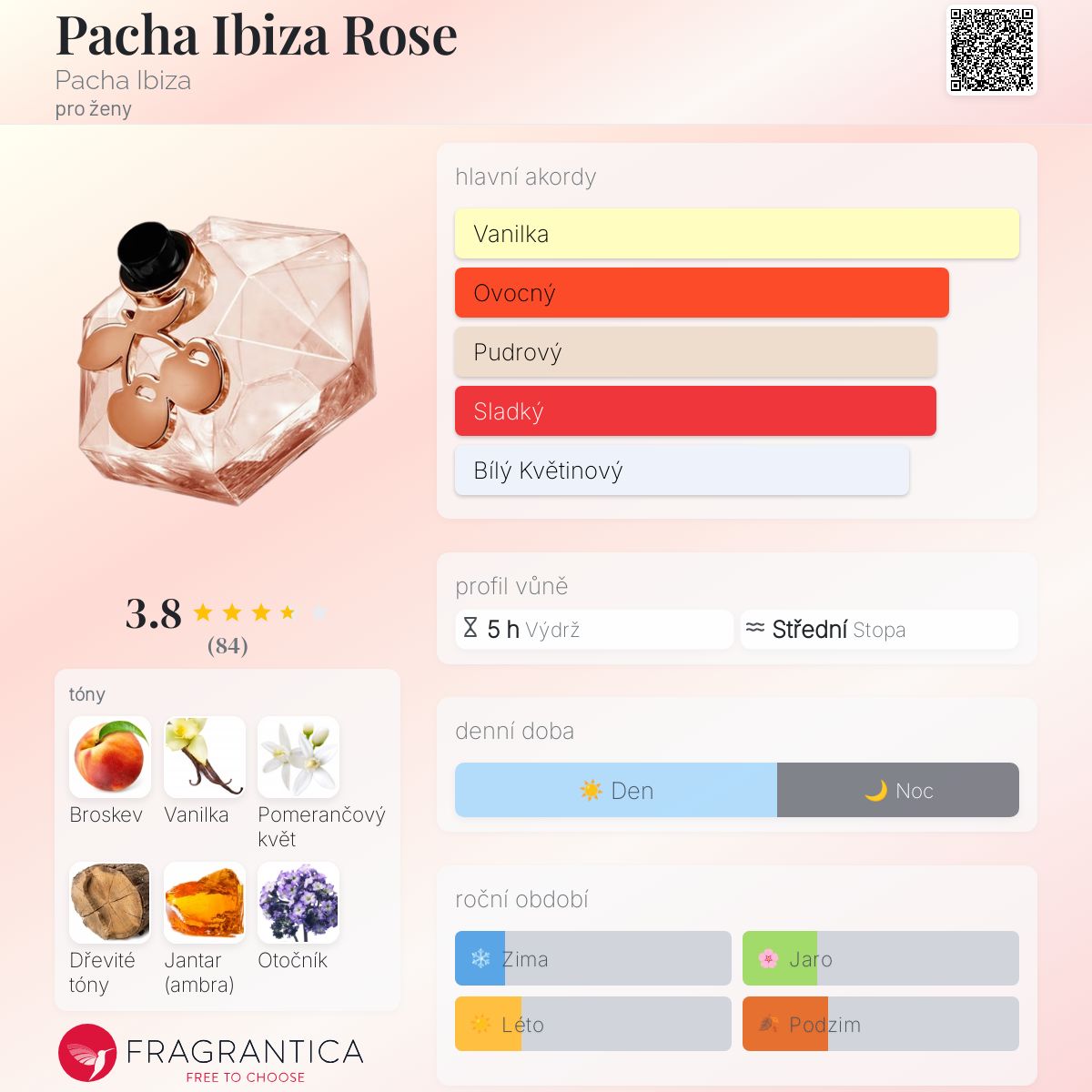 Pacha Ibiza Rose podle Pacha Ibiza je Floral Fruity vůně pro ženy. Pacha Ibiza Rose byl/a uveden/a v roce 2013. Vrchní tóny jsou Broskev a Hruška; střední tóny jsouPomerančový květ a Otočník ; základní tóny jsou Vanilka, Dřevité tóny a Jantar (ambra).