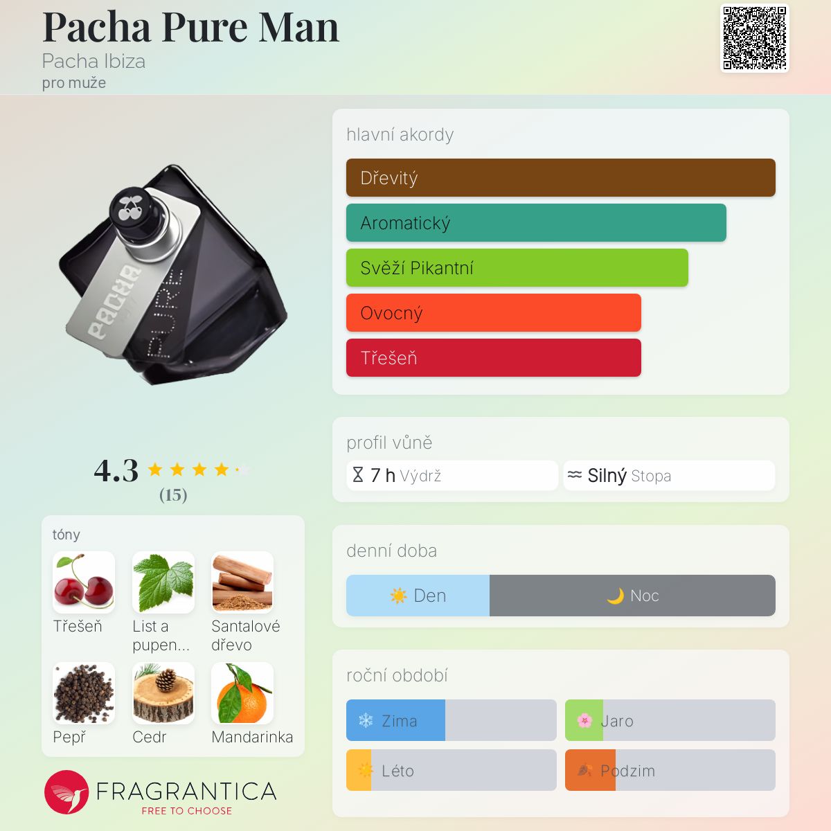 Pacha Pure Man podle Pacha Ibiza je Woody Spicy vůně pro muže. Pacha Pure Man byl/a uveden/a v roce 2006. Vrchní tóny jsou Mandarinka, Bergamot, Rozmarýn a Tymián; střední tóny jsouTřešeň, Černý rybíz, Pepř a Paulinie nápojná ; základní tóny jsou Santalové dřevo, Cedr, Pačuli a Bílé pižmo.