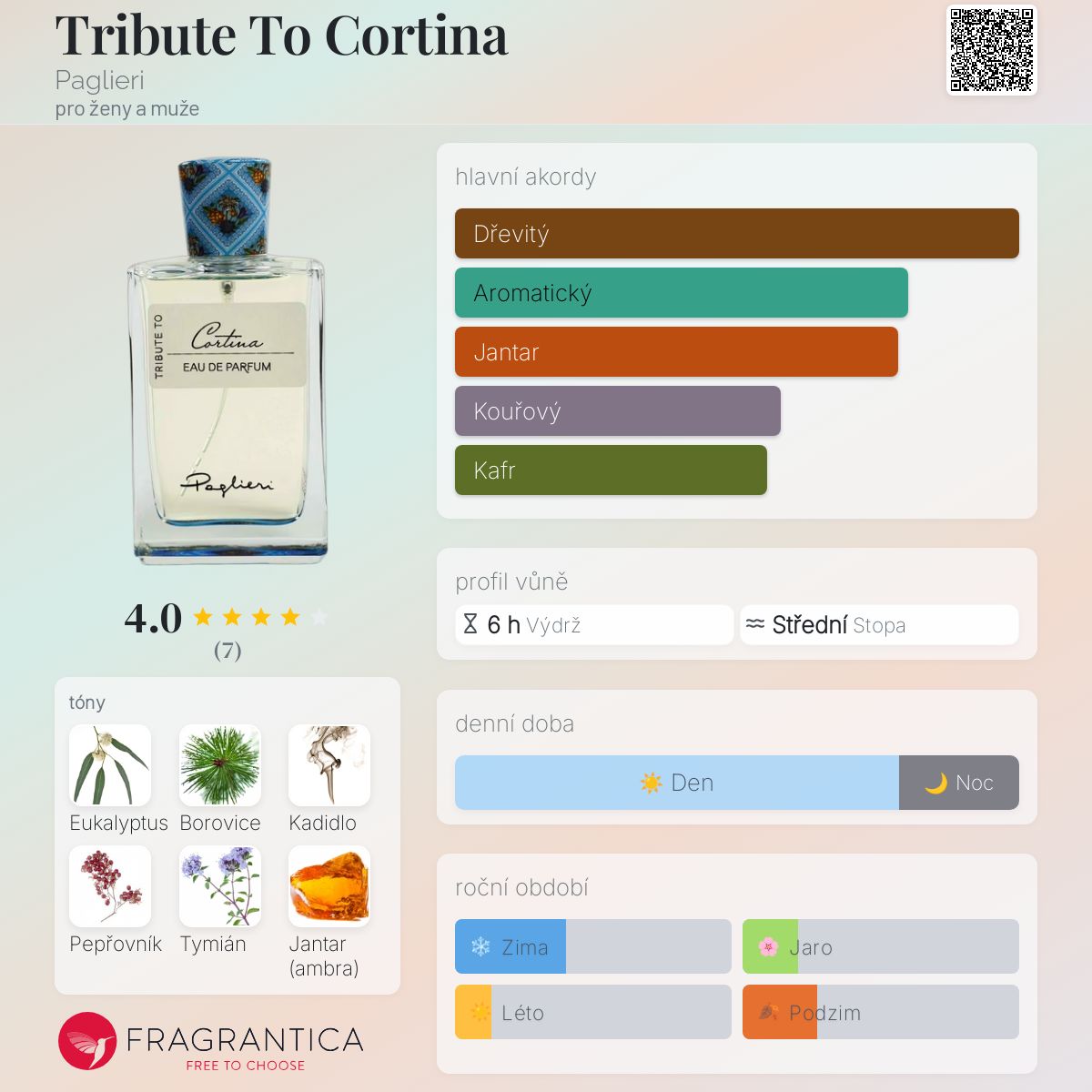 Tribute To Cortina podle Paglieri je vůně pro ženy a muže. Tribute To Cortina byl/a uveden/a v roce 2022. Vrchní tóny jsou Eukalyptus, Sibiřská borovice a Pepřovník; střední tóny jsouKadidlo, Tymián a Jantar (ambra) ; základní tóny jsou Cedr, Fazole tonka, Guajakové dřevo a Pižmo.