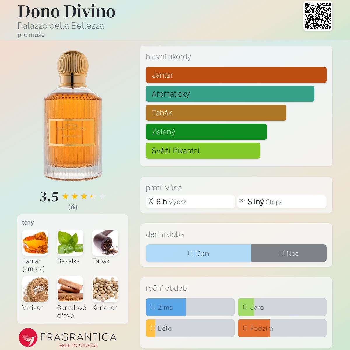 Dono Divino podle Palazzo della Bellezza je Woody Aromatic vůně pro muže. Toto je nová vůně. Dono Divino byl/a uveden/a v roce 2024. Vrchní tóny jsou Bazalka, Koriandr, Grapefruit a Muškátový oříšek; střední tóny jsouVetiver, Kardamom, Zázvor a Pomerančový květ ; základní tóny jsou Jantar (ambra), Tabák, Santalové dřevo, Pižmo a Cedr.