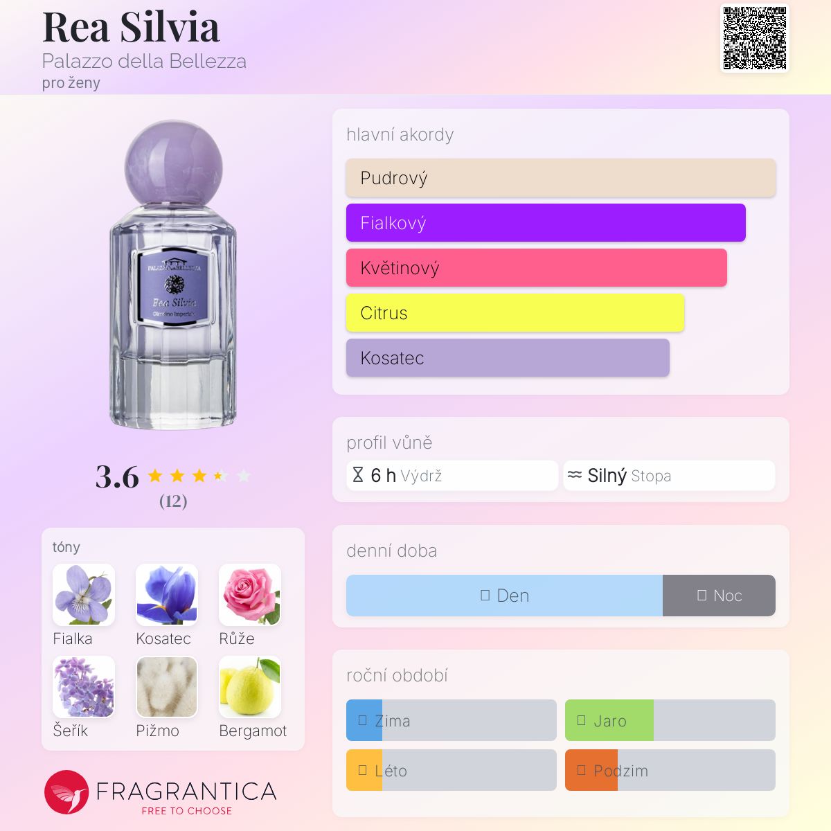 Rea Silvia podle Palazzo della Bellezza je Floral Fruity vůně pro ženy. Toto je nová vůně. Rea Silvia byl/a uveden/a v roce 2024. Vrchní tóny jsou Bergamot, Mandarinka a Peruánský pepř; střední tóny jsouFialka, Růže, Šeřík a Pelargónie ; základní tóny jsou Kosatec, Pižmo, Pačuli, Dubový mech a Jantar (ambra).