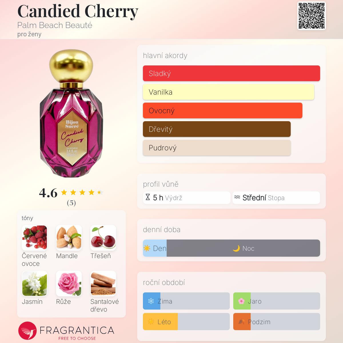 Candied Cherry podle Palm Beach Beauté je Floral Fruity Gourmand vůně pro ženy. Candied Cherry byl/a uveden/a v roce 2024. Vrchní tóny jsou Červené ovoce, Mandle a Třešeň; střední tóny jsouJasmín a Růže ; základní tóny jsou Santalové dřevo, Fazole tonka, Vanilka, Pižmo a Mech.