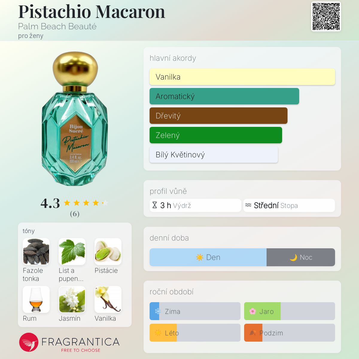 Pistachio Macaron podle Palm Beach Beauté je Floral Fruity Gourmand vůně pro ženy. Pistachio Macaron byl/a uveden/a v roce 2024. Vrchní tóny jsou Černý rybíz, Pistácie a Rum; střední tóny jsouJasmín a Pomerančový květ ; základní tóny jsou Fazole tonka, Vanilka a Pižmo.