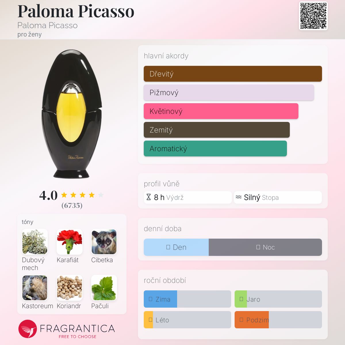 To, že parfém určený pro ženy působí o pětatřicet let později jako kvazimužská formule, vypovídá o tom, jaké vůně dominovaly osmdesátým letům. Neexistuje žádná svého druhu, pokud se nezaměříme na akvarelové květinové vůně, teskné Beatiful, Anais Anais a tak dále, kterou by dnes nemohl nosit muž. V osmdesátých letech byla noc temná, divoká a zlověstná. Existovaly již určité tóny medového a pryskyřičného želé, které explodovaly na počátku devadesátých let, ale archetypem osmdesátých let byl vražedný chypre. Reklamu na ně dělaly sofistikované modelky oblečené do saténu a saténové látky, v šatech na ramena, ale stejně dobře mohli v reklamě použít Conana Barbara, protože ten by nevypadal nepatřičně. Všechny vyvolávaly představu extrémního svádění, bezohledné přírody s divokými zvířaty, dekadence a nebezpečí, velkých tenebrovských salonů. Paloma Picasso je ztělesněním tohoto proudu chypre, který vzbudí i mrtvého muže.