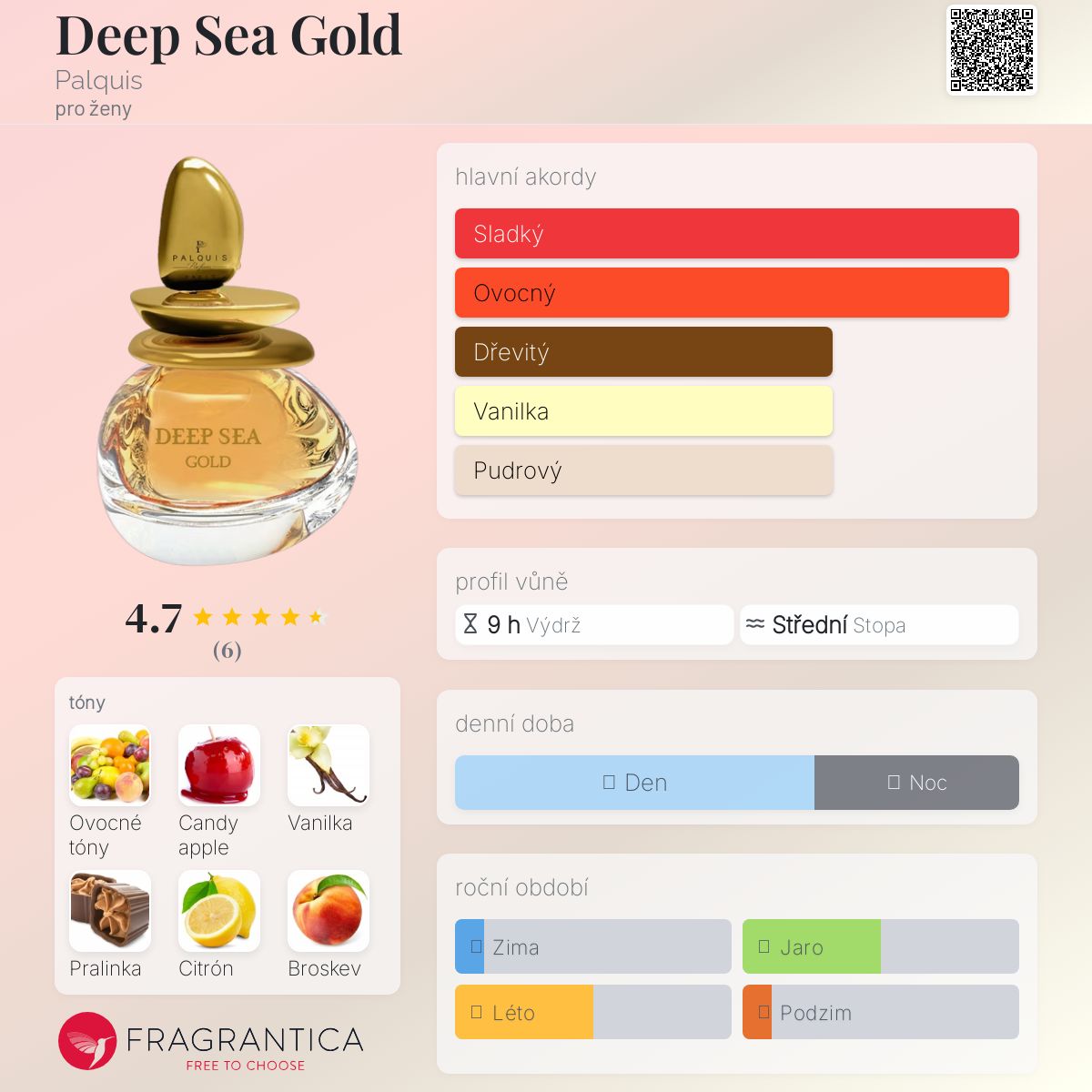 Deep Sea Gold podle Palquis je Floral Fruity vůně pro ženy. Deep Sea Gold byl/a uveden/a v roce 2018. Vrchní tóny jsou Exotické ovoce, Citrón a Broskev; střední tóny jsouSladké jablko, Jasmín a Pivoňka ; základní tóny jsou Vanilka, Pralinka, Santalové dřevo, Cedr a Pižmo.