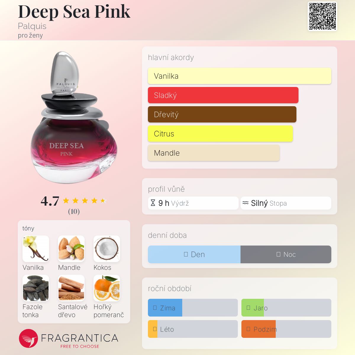 Deep Sea Pink podle Palquis je Floral Fruity Gourmand vůně pro ženy. Deep Sea Pink byl/a uveden/a v roce 2018. Vrchní tóny jsou Hořký pomeranč, Skořice, Bergamot a Růžový pepř; střední tóny jsouMandle, Kokos a Růže ; základní tóny jsou Vanilka, Mandle, Fazole tonka, Santalové dřevo a Cedr.