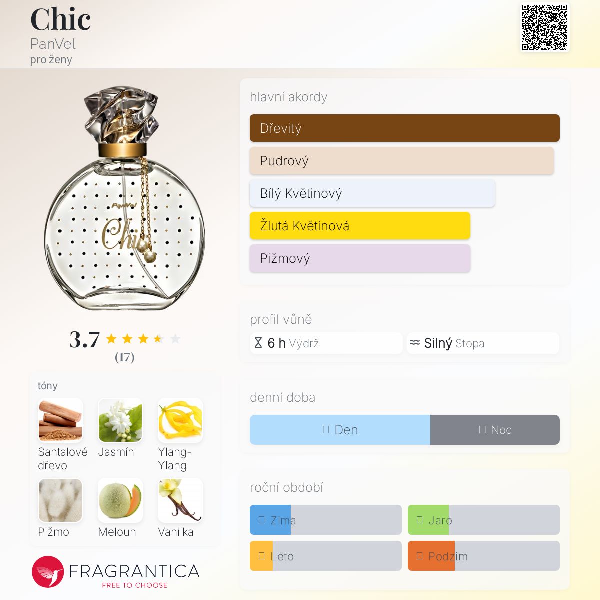Chic podle PanVel je Orientální Vanilla vůně pro ženy. Chic byl/a uveden/a v roce 2014. Vrchní tóny jsou Santalové dřevo a Vanilka; střední tóny jsouYlang-Ylang a Meloun ; základní tóny jsou Jasmín, Pižmo a Kosatec.