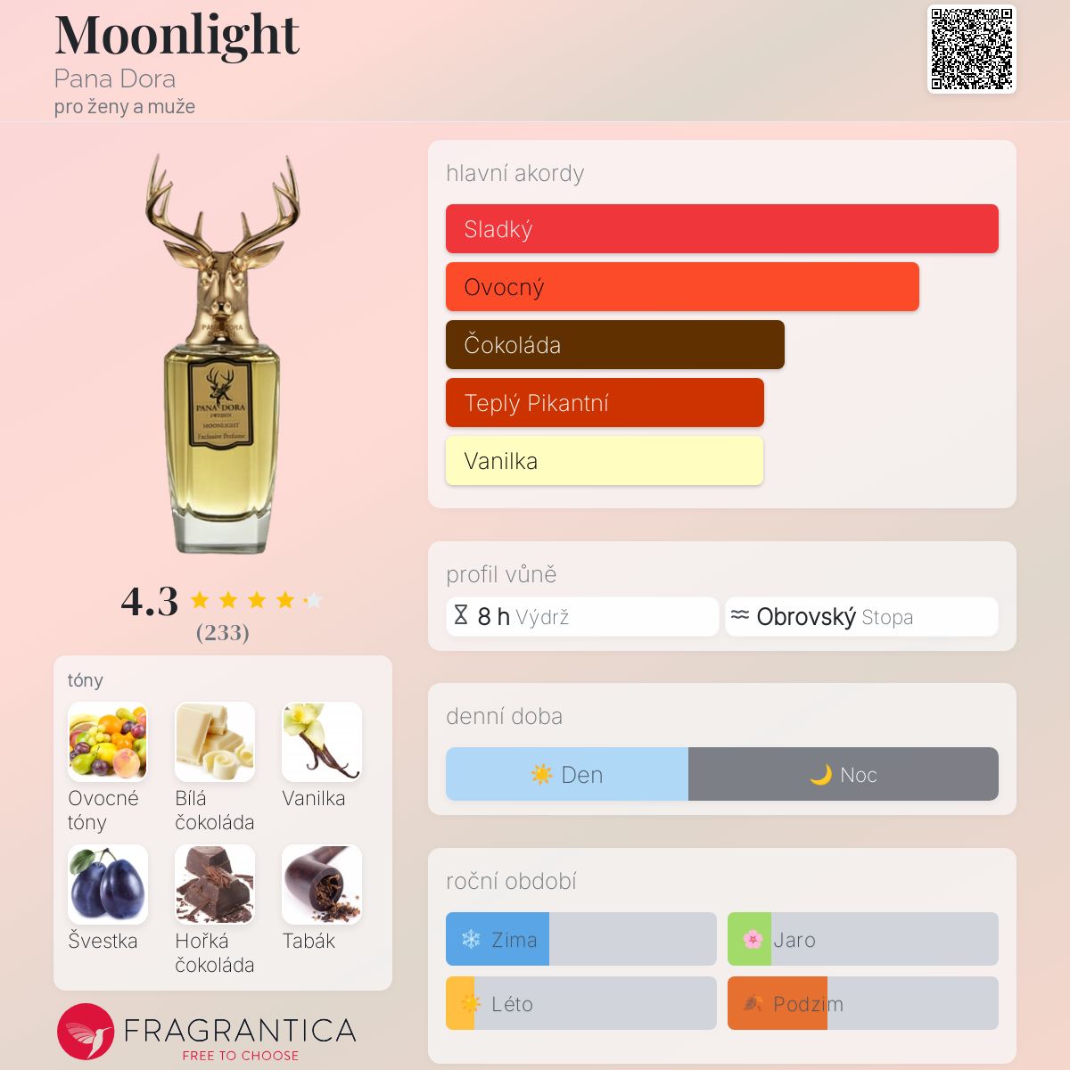 Moonlight podle Pana Dora je Orientální Vanilla vůně pro ženy a muže. Moonlight byl/a uveden/a v roce 2023. "Nosem" za touto vůní je Ibrahim Al Zoabi. Vrchní tóny jsou Švestka a Mandarinka; střední tóny jsouOvocné tóny, Čokoláda, List hřebíčku a Broskev ; základní tóny jsou Bílá čokoláda, Vanilka, Tabák, Jantar (ambra), Med, Pižmo a Cedr.