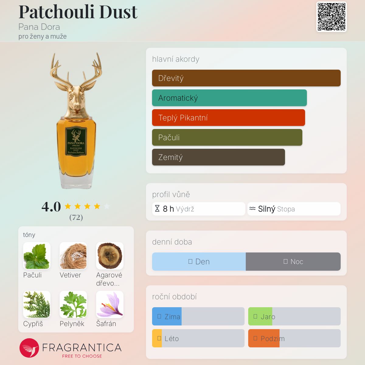 Patchouli Dust podle Pana Dora je Orientální vůně pro ženy a muže. Patchouli Dust byl/a uveden/a v roce 2023. "Nosem" za touto vůní je Ibrahim Al Zoabi. Vrchní tóny jsou Pačuli, Cypřiš, Pelyněk, Šafrán a Kardamom; střední tóny jsouVetiver, Muškátový oříšek a Taif růže ; základní tóny jsou Agarové dřevo (oud), Vanilka, Cedr, Jantar (ambra) a Fazole tonka.