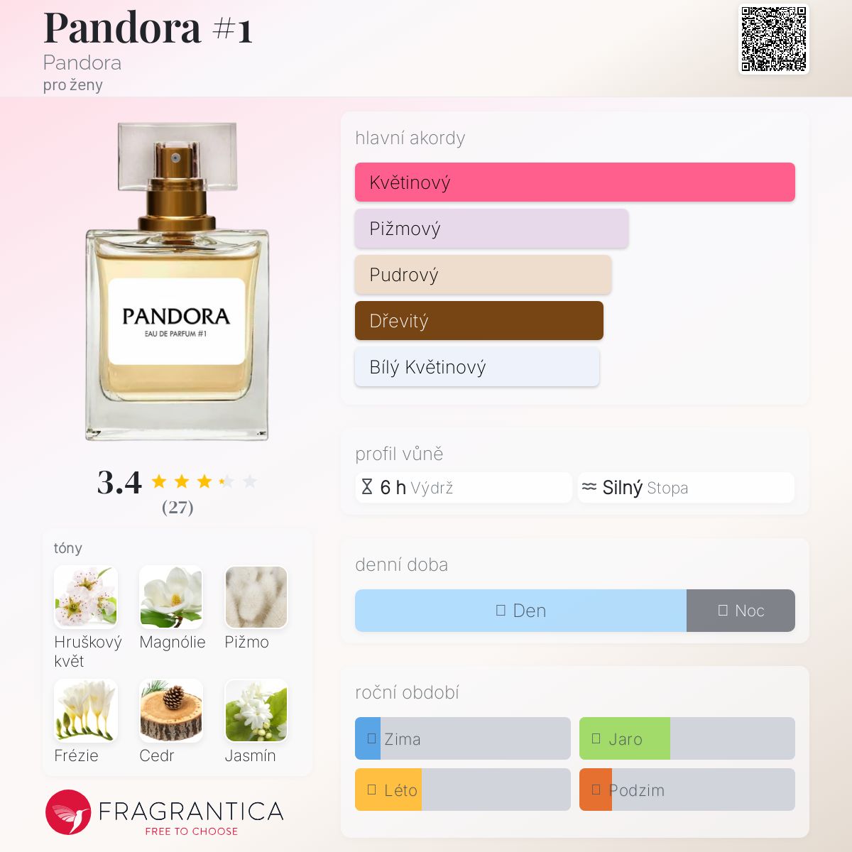 Pandora #1 podle Pandora je Floral Fruity vůně pro ženy. Pandora #1 byl/a uveden/a v roce 2019. "Nosem" za touto vůní je Alain Allione. Vrchní tóny jsou Hruškový květ, Bergamot a Mandarinka; střední tóny jsouMagnólie, Frézie, Jasmín, Broskev, Tuberóza a Orchidej ; základní tóny jsou Pižmo, Cedr a Vanilka.