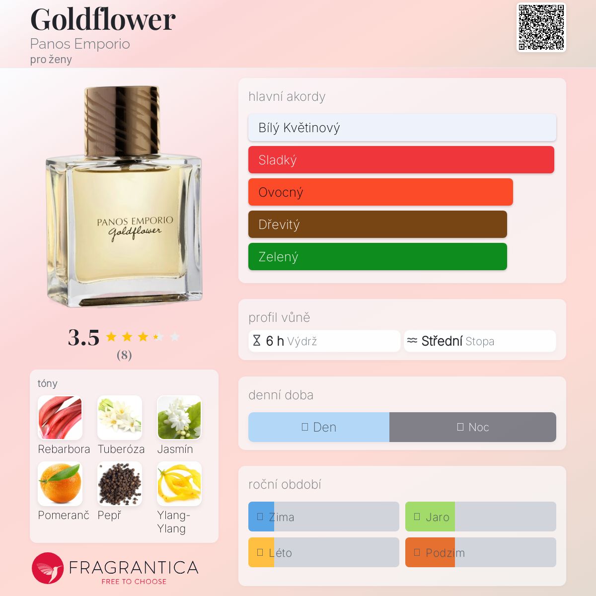 Goldflower podle Panos Emporio je Aromatic vůně pro ženy. Vrchní tóny jsou Rebarbora, Černý a růžový pepř a Ylang-Ylang; střední tóny jsouTuberóza, Jasmín, Broskev, Kokos a Růže ; základní tóny jsou Pomeranč, Jantarové dřevo, Vanilka, Pačuli a Pižmo.