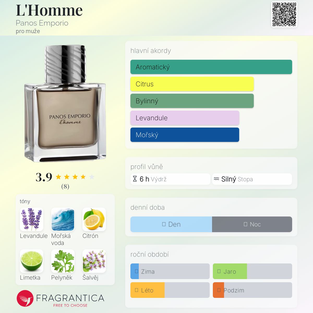 L'Homme podle Panos Emporio je Aromatic Spicy vůně pro muže. Vrchní tóny jsou Citrón, Limetka a Pelyněk; střední tóny jsouLevandule, Mořské tóny a Šalvěj ; základní tóny jsou Pačuli, Pižmo a Ambroxan.