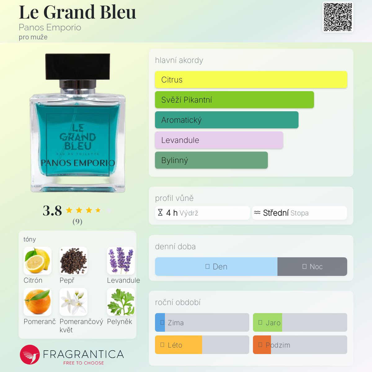 Le Grand Bleu podle Panos Emporio je Aromatic Aquatic vůně pro muže. Le Grand Bleu byl/a uveden/a v roce 2016. Vrchní tóny jsou Citrón, Černý pepř a Pomeranč; střední tóny jsouLevandule, Pomerančový květ a Pelyněk ; základní tóny jsou Cedr, Kůže a Benzoin.