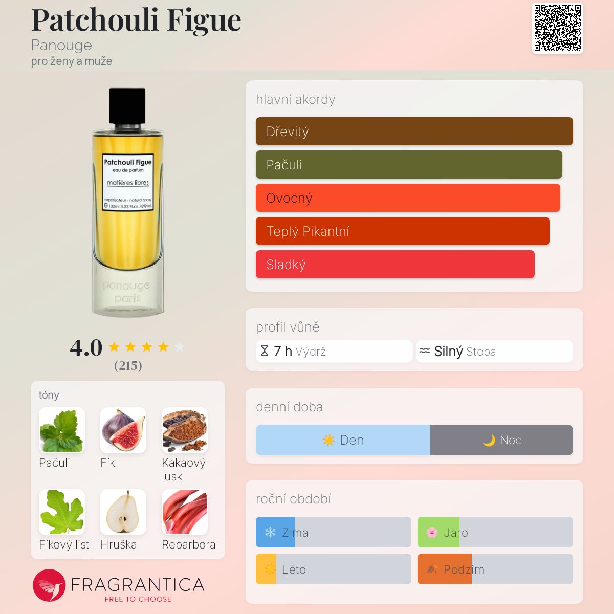 Patchouli Figue podle Panouge je Chypre Fruity vůně pro ženy a muže. Patchouli Figue byl/a uveden/a v roce 2021. "Nosem" za touto vůní je Marie Schnirer. Vrchní tóny jsou Fíkový list, Hruška a Rebarbora; střední tóny jsouFíkový nektar a Jasmín ; základní tóny jsou Pačuli, Kakao, Jantar (ambra) a Cedr.
