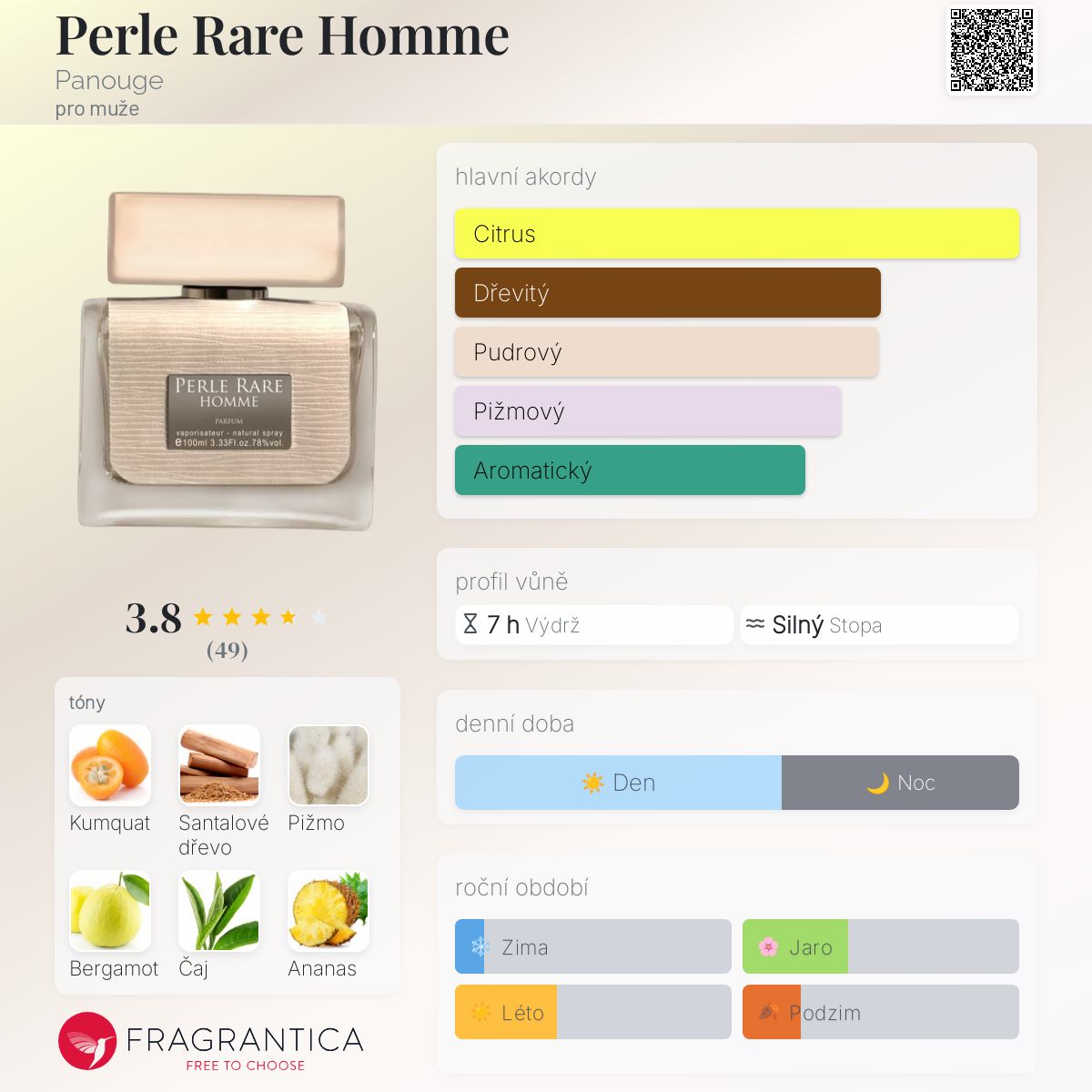 Perle Rare Homme podle Panouge je Woody Aromatic vůně pro muže. Perle Rare Homme byl/a uveden/a v roce 2015. Vrchní tóny jsou Kumquat, Bergamot a Ananas; střední tóny jsouZelený čaj a Růže ; základní tóny jsou Santalové dřevo, Bílé pižmo a Křišťálový jantar.
