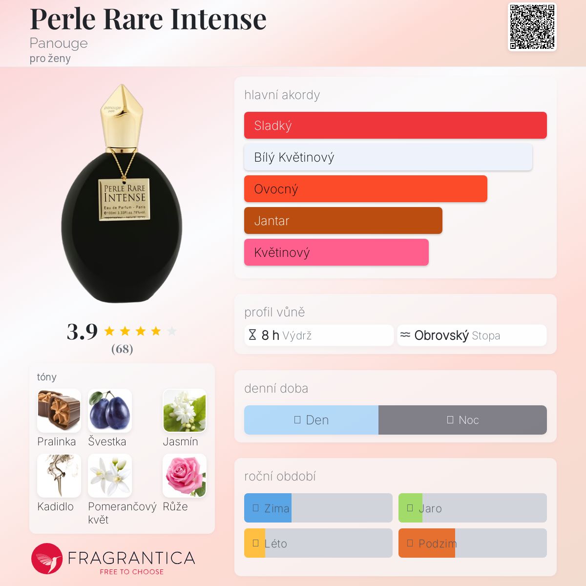 Perle Rare Intense podle Panouge je Orientální Floral vůně pro ženy. Perle Rare Intense byl/a uveden/a v roce 2016. Vrchní tóny jsou Švestka, Vonokvětka a Růžový pepř; střední tóny jsouJasmín, Pomerančový květ a Růže ; základní tóny jsou Pralinka, Kadidlo, Pačuli a Pižmo.