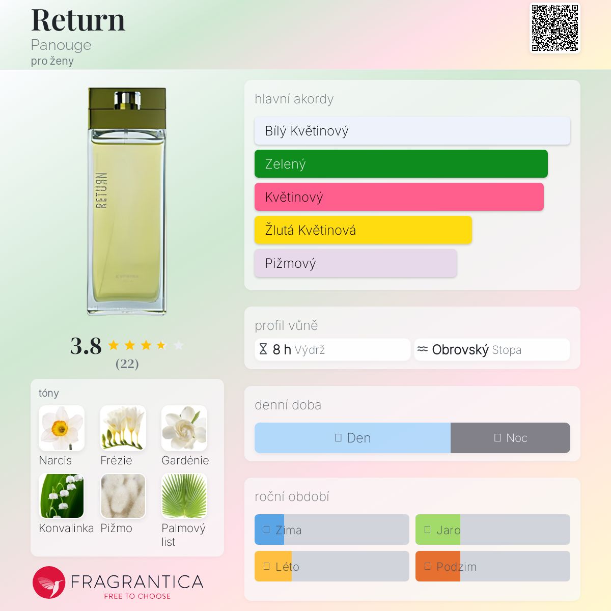 Return podle Panouge je Floral vůně pro ženy. Return byl/a uveden/a v roce 1990. Vrchní tóny jsou Narcis, Konvalinka a Palma; střední tóny jsouFrézie, Gardénie a Růže ; základní tóny jsou Pižmo, Černý rybíz a Dubový mech.