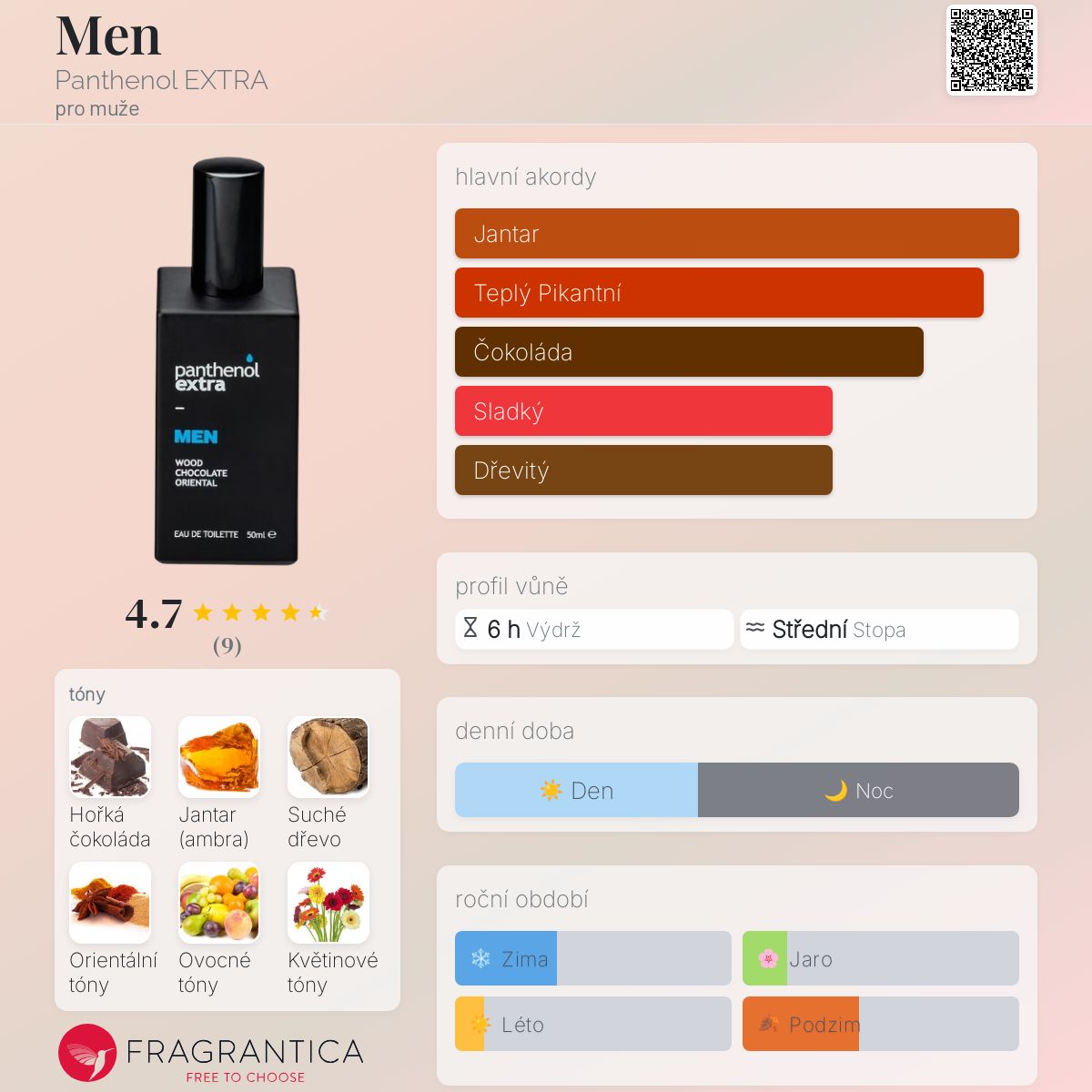 Men podle Panthenol EXTRA je Orientální Woody vůně pro muže. Vrchní tóny jsou Suché dřevo, Exotické ovoce a Květiny; střední tón jeČokoláda ; základní tóny jsou Jantar (ambra), Orientální tóny a Pižmo.