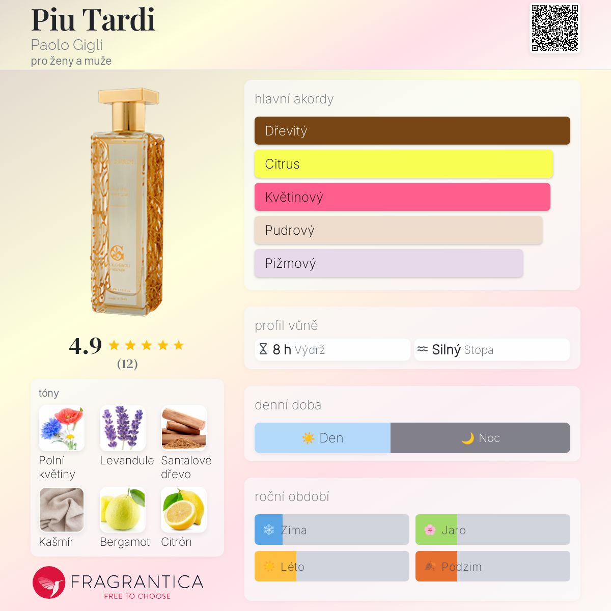 Piu Tardi podle Paolo Gigli je Aromatic Spicy vůně pro ženy a muže. Vrchní tóny jsou Levandule, Bergamot a Citrón; střední tón jePolní květiny ; základní tóny jsou Santalové dřevo, Kašmír, Pižmo a Jantar (ambra).