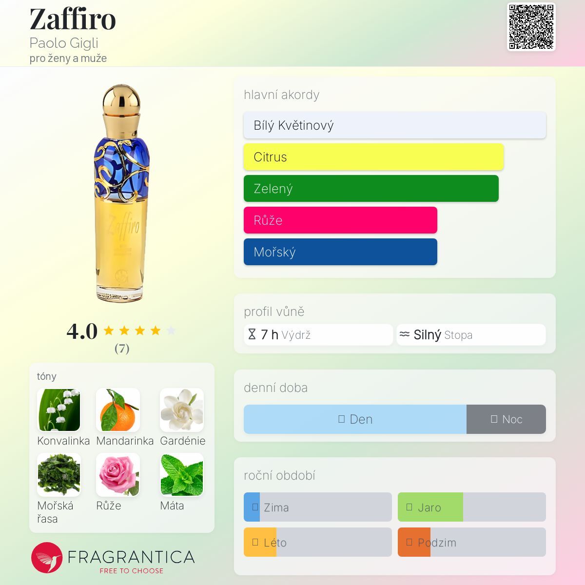 Zaffiro podle Paolo Gigli je Citrus Aromatic vůně pro ženy a muže. Vrchní tóny jsou Konvalinka, Mandarinka, Gardénie, Růže, Máta, Pomeranč a Hyacint; střední tóny jsouMořská řasa a Švestka ; základní tóny jsou Jantar (ambra), Bílé pižmo a Fialka.