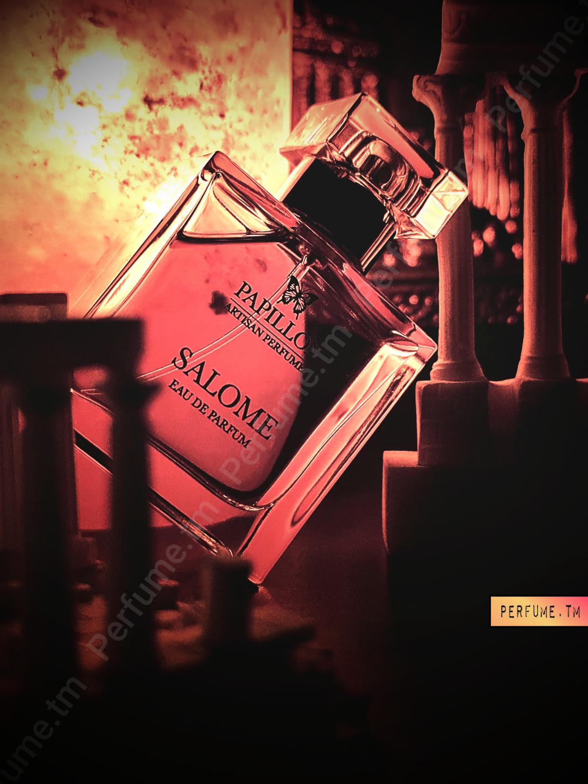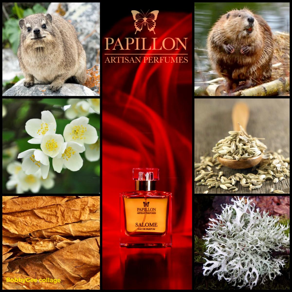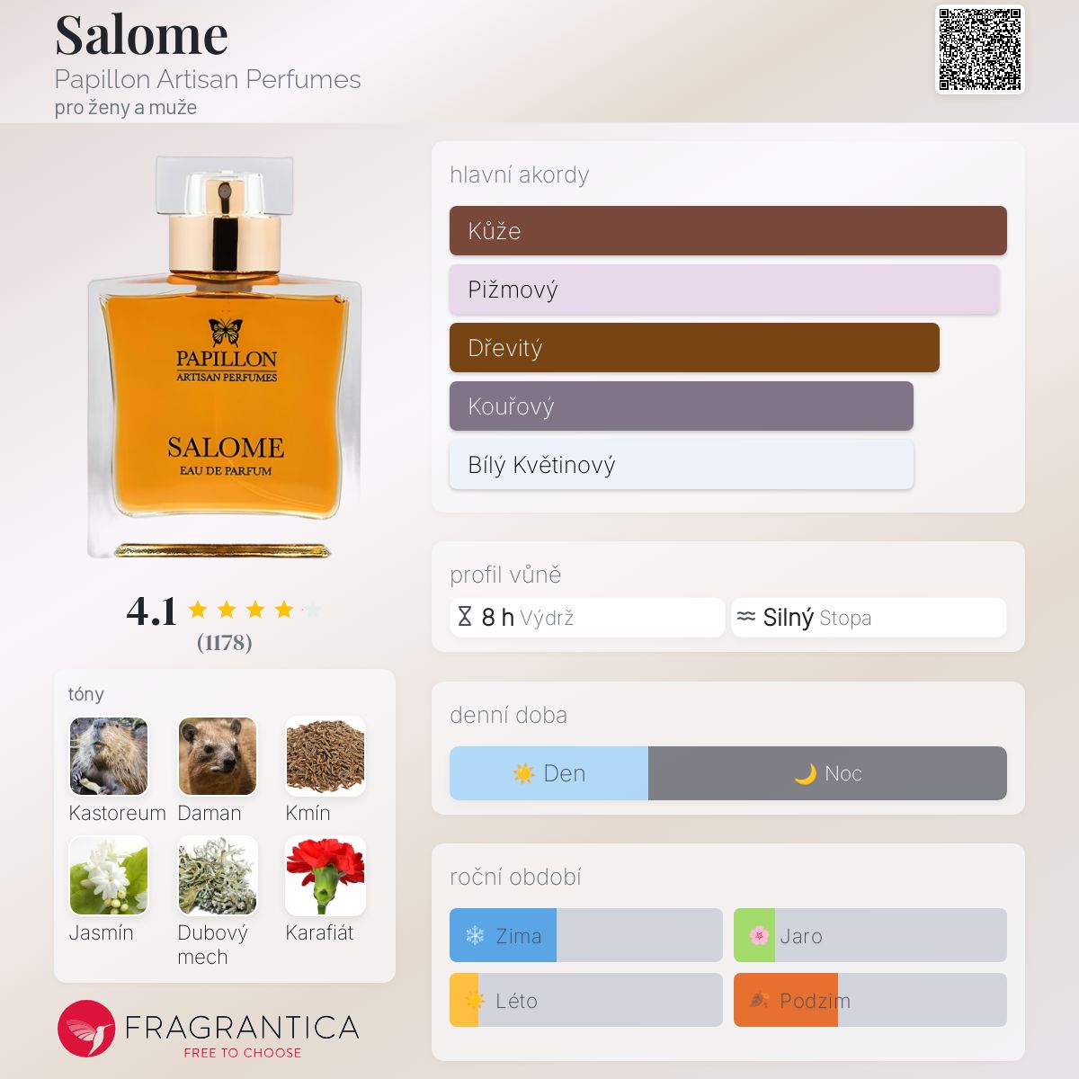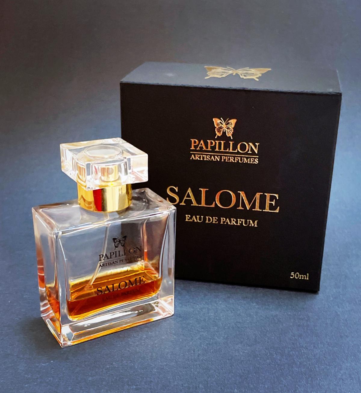 Salome podle Papillon Artisan Perfumes je Chypre Floral vůně pro ženy a muže. Salome byl/a uveden/a v roce 2015. Vrchní tóny jsou Hořký pomeranč a Bergamot; střední tóny jsouDaman, Jasmín, Karafiát, Tabák, Turecká růže a Pomerančový květ ; základní tóny jsou Kastoreum, Kmín, Dubový mech, Seno, Styrax, Pačuli, Bříza a Vanilka.