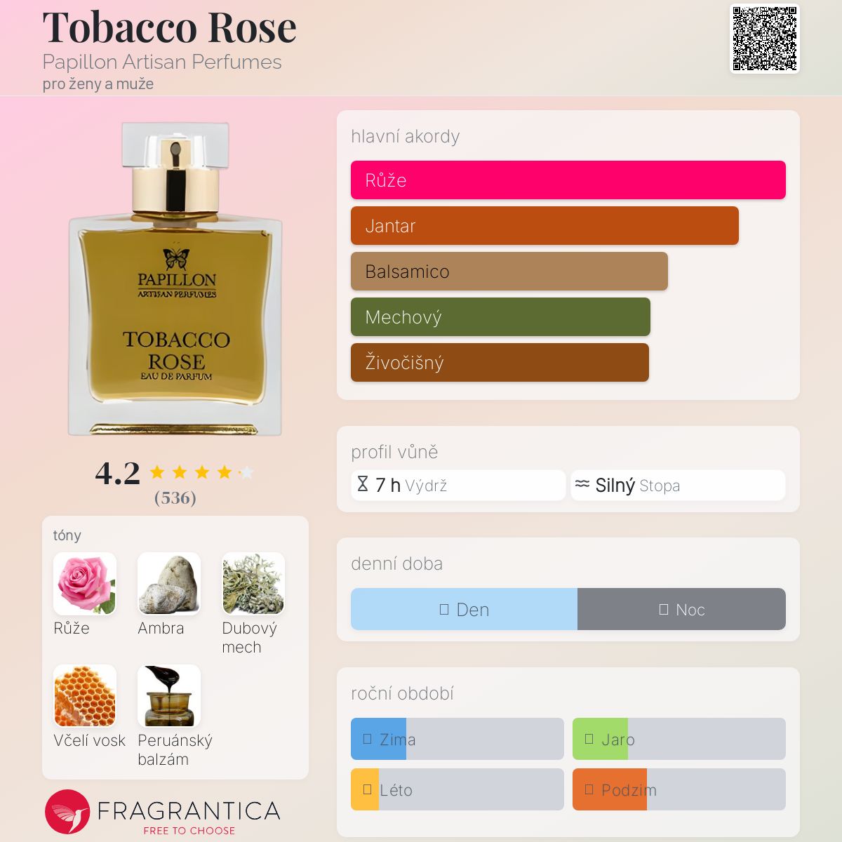 Tobacco Rose podle Papillon Artisan Perfumes je Floral vůně pro ženy a muže. Tobacco Rose byl/a uveden/a v roce 2014. "Nosem" za touto vůní je Liz Moores.