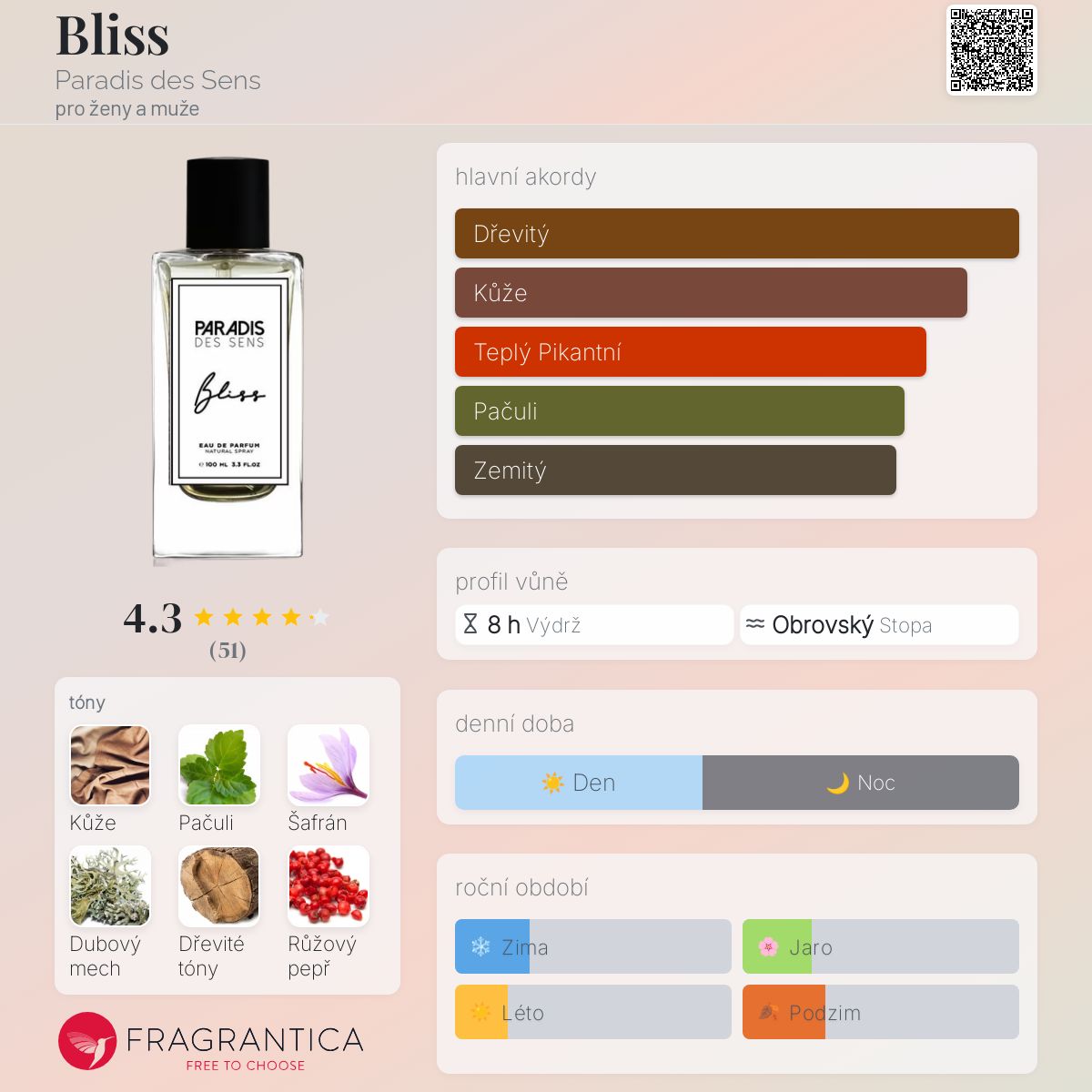 Bliss podle Paradis des Sens je Leather vůně pro ženy a muže. Bliss byl/a uveden/a v roce 2020. Vrchní tóny jsou Růžový pepř a Maliny; střední tóny jsouKůže, Šafrán a Jasmín ; základní tóny jsou Pačuli, Dubový mech, Dřevité tóny a Jantar (ambra).